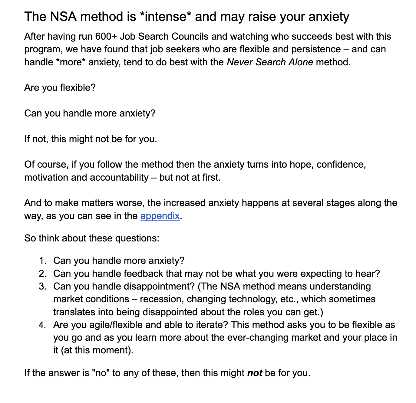 The job search is such a grueling psychological ordeal. It’s so hard to make and keep promises to myself. “I’ll finish my resume today!” I say. “I’ll send out 10 applications tomorrow!” So it’s a resonant place for Never Search Alone to begin: by galvanizing the importance of keeping this commitment to the search council, they set the stage for the self-integrity that’s going to be necessary to send this process home.