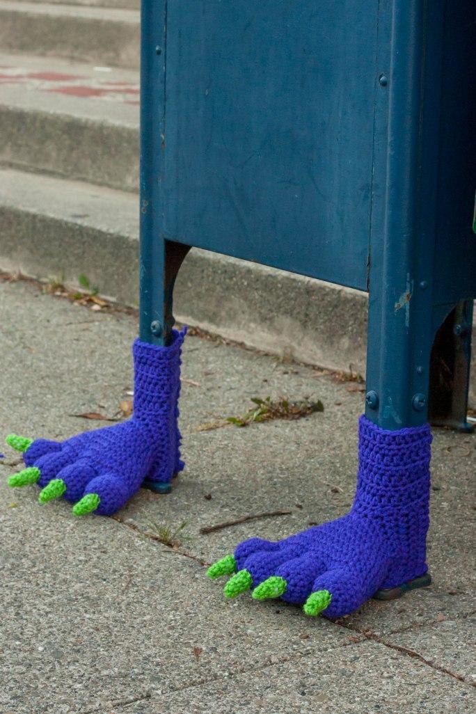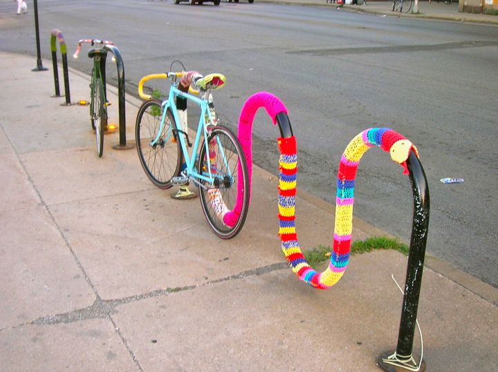 Yarn bombing is the practice of graffitiing public spaces with cozy, whimsical knitted things.